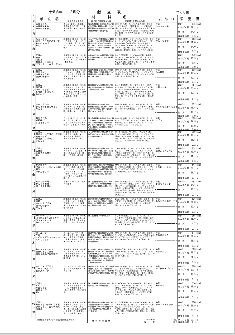 3月の献立です🌸