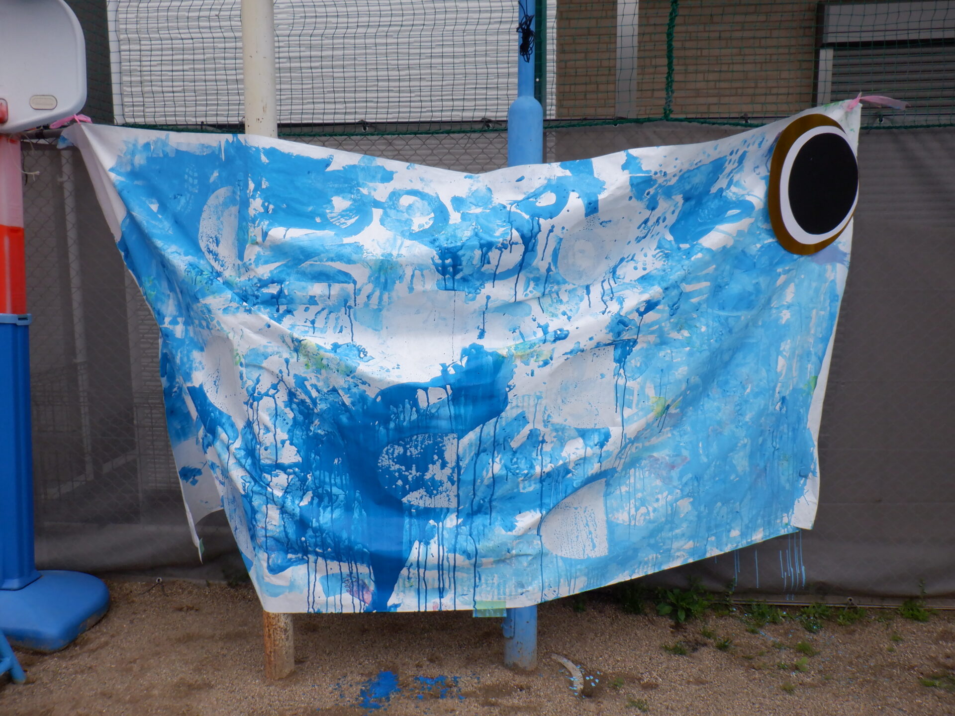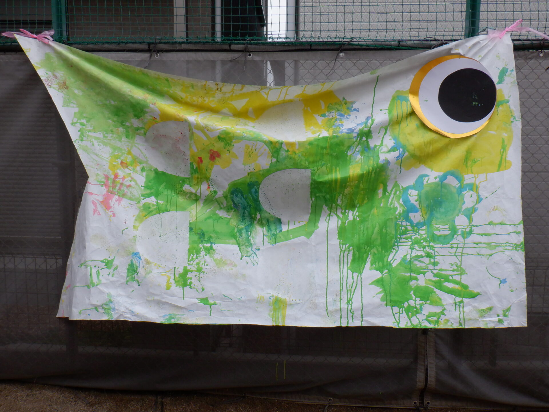 大きい布に絵の具で色をつけて、カラフルな3匹のこいのぼりが完成しました。